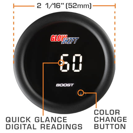 GlowShift 10 Color Digital Series 60 PSI Boost Gauges are electronically driven and read boost pressure from 0 to 60 PSI with unrivaled accuracy. A digital boost gauge is essential to any diesel truck or modified car that runs high boost pressure, displaying boost levels on a responsive ultra-bright digital LED display. Boost gauges are key to avoiding over or underboosting which could cause critical engine damage. This diesel boost gauge includes a 1/8-27 NPT Electronic Boost Pressure Sensor, 9’ Sensor Harness and more for installation.