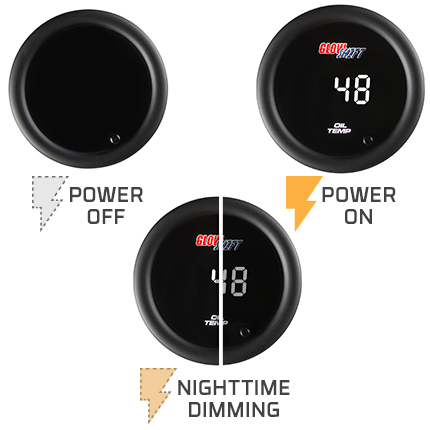 The 10 Color Digital Series features a flat black gauge face and low profile tinted lens with bright LED digital numerical readouts. Each gauge has an ultra-thin design with a depth of 1-1/16” (27mm) and display that measures 3/8” x 5/8” (9.5mm x 15.92mm). Set the display to one of 10 available colors. At startup, Self-Calibration Mode ensures the gauge is performing optimally. For easier viewing at night, connect the orange wire to the headlight switch source and the gauge will dim 50%.