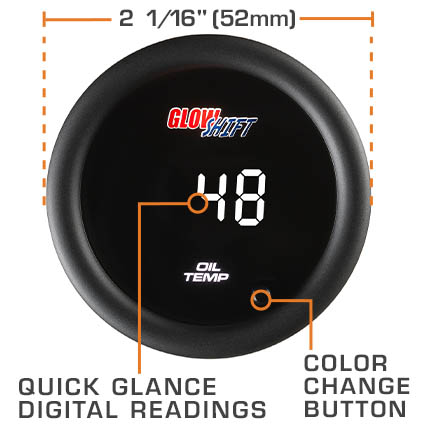 GlowShift 10 Color Digital Series Celsius Oil Temperature Gauges are electronically driven and read your engine’s oil temperature from 20° to 150° Celsius with unrivaled accuracy. A digital oil temperature gauge is essential for any car or truck because it allows you to closely monitor changing temperatures, avoiding spikes that could cause harmful wear to critical engine parts. This Celsius oil temperature gauge kit comes with a 1/8-27 NPT Temperature Sensor, 2’ Sensor/Power Harness and more for installation.