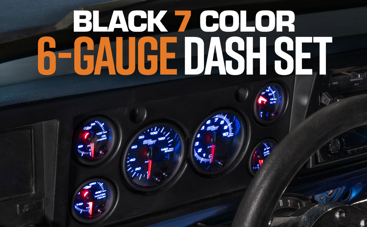 GlowShift Black 7 Color Series 3-3/8” 6 Gauge Custom Dashboard Sets for cars and trucks are essential to your custom instrument cluster build. This dash gauge set includes a 3-3/8” (85mm) In Dash Tachometer and In Dash Speedometer with 2-1/16” (52mm) Oil Pressure, Water Temp, Volt and Fuel Level Gauges. Install these automotive 6 gauge sets to performance vehicles, show cars, racing applications, workhorse trucks and more. They are designed for drivers looking to replace stock gauges or completely overhaul their factory dashboard.