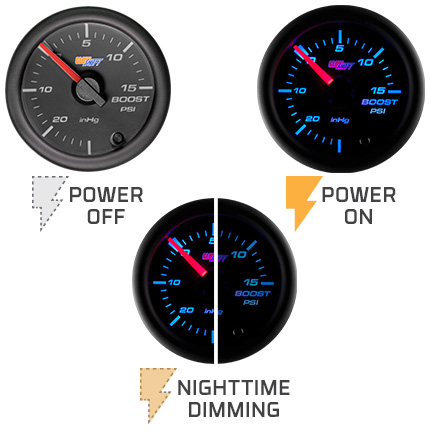 This gauge features LED backlighting which results in an ultra-bright display that delivers clear and vivid readouts. On or off, the gauge will look great courtesy of the black gauge face and magnified lens which are at the heart of this Gauge Series. By connecting the orange wire from the power harness to the factory headlight switch, you can dim the gauge 30% when the headlights are on. |