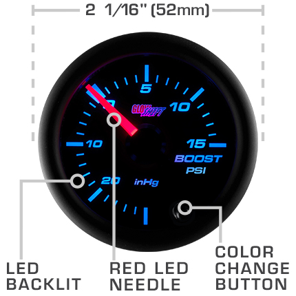 GlowShift’s Black 7 Color Series 15 PSI Boost/Vacuum Gauge is for anyone running a turbo or supercharger in their car or truck. This 2-1/16” (52mm) mechanically operated turbo boost gauge will monitor your vehicle’s boost and vacuum levels from -30 inHG to 15 PSI with unrivaled accuracy.