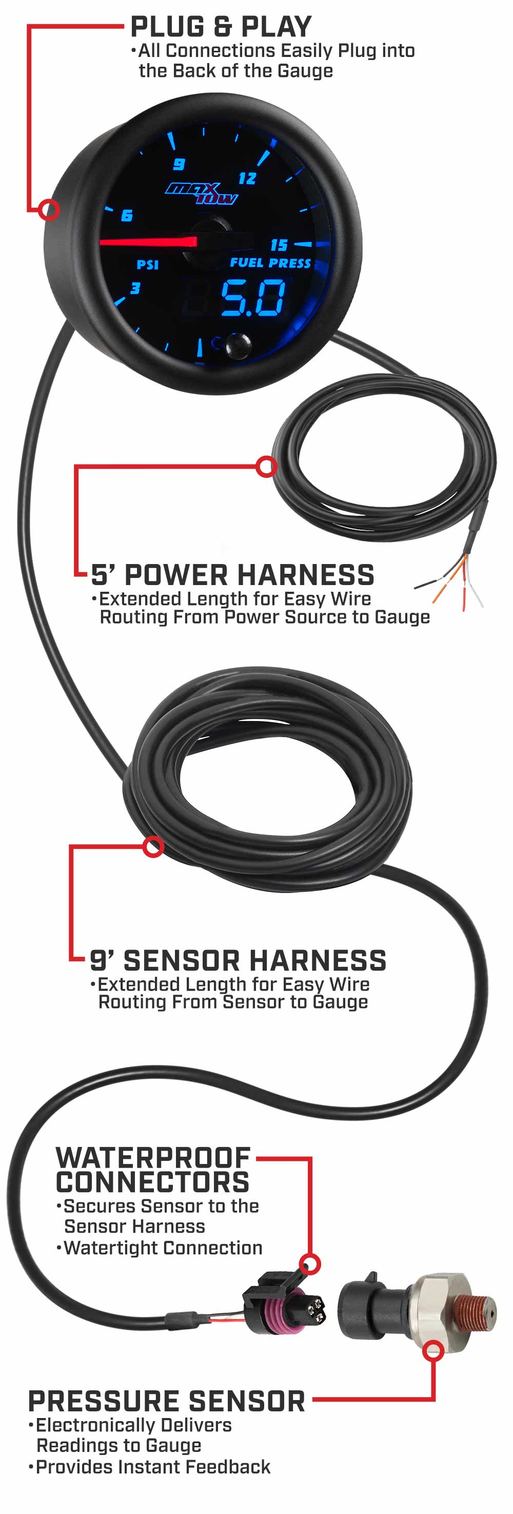 MaxTow 15 PSI Fuel Pressure Gauges for trucks feature sensor and power harnesses with extended lengths for added flexibility during installation. The sensor harness is 9’ and the power harness is 5’, assuring you’ll have more than enough wiring for a seamless install. Easily attach both harnesses to the back of this automotive fuel pressure gauge for trucks by utilizing Plug and Play connectors.