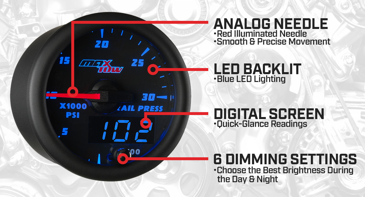 MaxTow Black & Blue Double Vision™ 30,000 PSI Fuel Rail Pressure Gauges are compatible with the 2003-2018 Dodge Ram 5.9 Cummins & 6.7 Cummins, and 2002-2018 Chevrolet Silverado or GMC Sierra 6.6 Duramax. This diesel fuel rail pressure gauge reads your truck’s high fuel pressure levels from 0 to 30,000 PSI directly from the common rail, monitoring your Cummins or Duramax engine with unrivaled accuracy. Protect against damage to the fuel pump and injectors while avoiding a loss in overall horsepower. Get ready to hit the road and Tow to the Max™