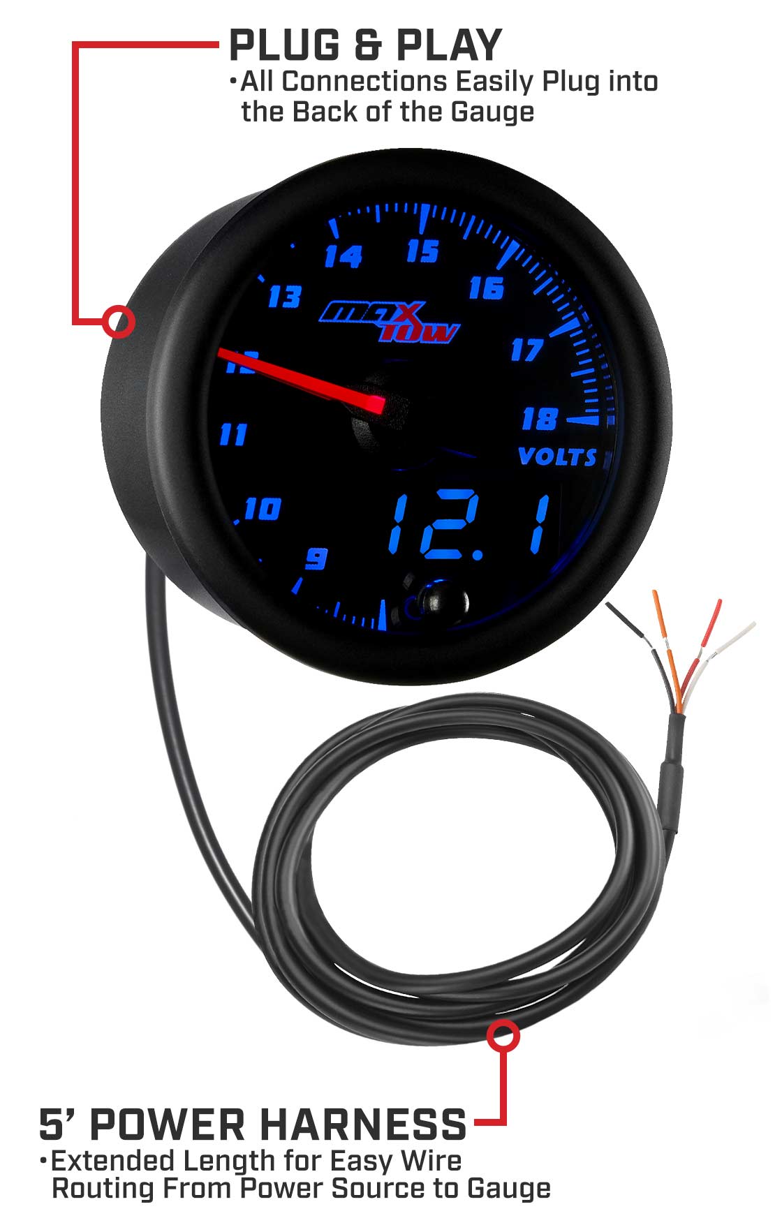 MaxTow Black & Blue Double Vision™ Truck Volt Gauges monitor your mid-size or full-size pickup’s electrical system from 8 to 18 volts. Check your truck’s battery to make sure it is providing a proper charge, or you can also detect a faulty alternator. This truck voltmeter includes a Color Coded Wiring Harness that connects this automotive volt gauge directly to the truck battery or another power source. Get ready to hit the road and Tow to the Max™