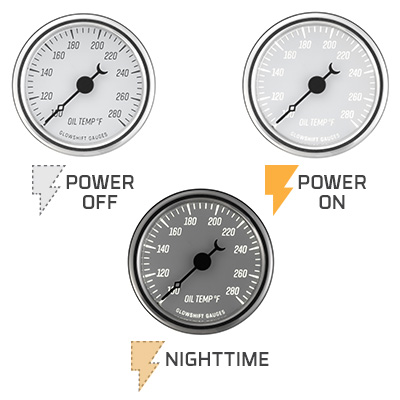 Classic Series White electronic gauges deliver a vintage style with premium modern parts and feature a faceplate design that offers a clean, simple and elegant look. These 2-1/16” (52mm) classic gauges for cars and trucks are equipped with a white dial, black analog tick marks, a black classic metal needle, flat clear lens, chrome trim ring and brighter, more traditional white LEDs. Access Nighttime Dimming Mode which dims the brightness 30% to reduce glare for optimal viewing at night.