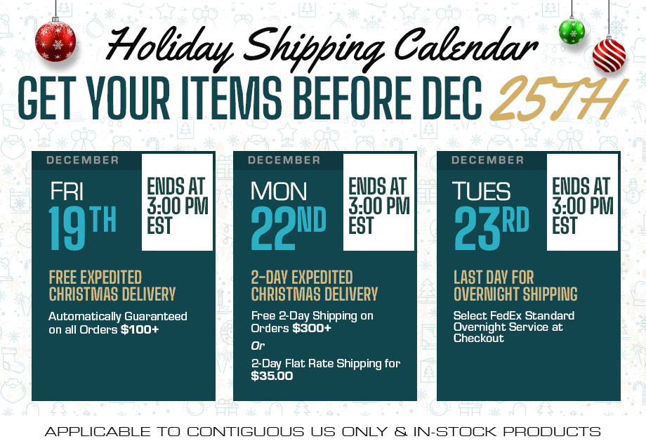 *Shipping guarantees apply only to items that are in stock and have shipped from our warehouse facility. We cannot guarantee your order arrives before December 25 if an item is backordered. In the event of a delayed package, GlowShift and the shipping carrier cannot be held liable. Please know that we will do everything we can within reason to ensure that your order is shipped and delivered in a timely manner. Expedited shipping options are available upon checkout.