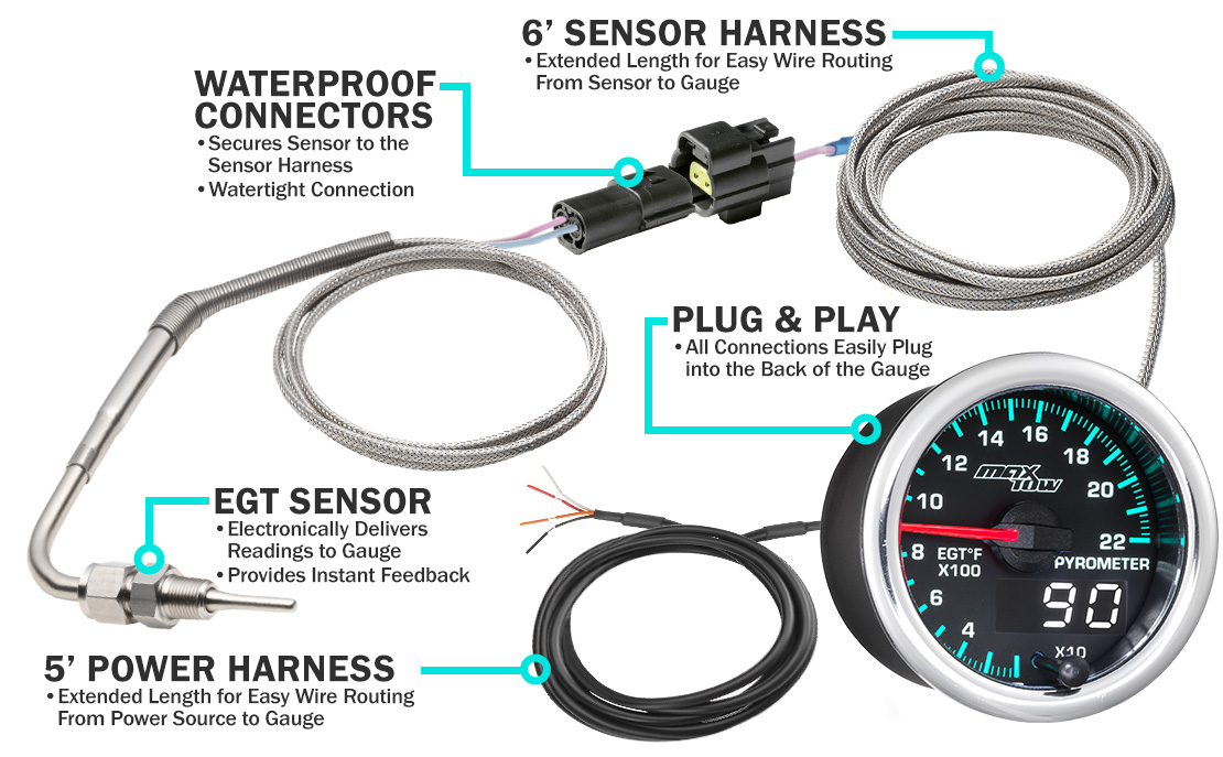 6.6 Duramax EGT Gauges at MaxTow feature Probe and Power Harnesses with extended lengths for added flexibility during installation. The Probe Harness is a total of 9’ including Steel Braided Cable and Waterproof Connectors. The Power Harness is 5’ long with ground connections. Effortlessly attach both harnesses to the back of the 6.6 Duramax Pyrometer by utilizing the Plug and Play connectors.