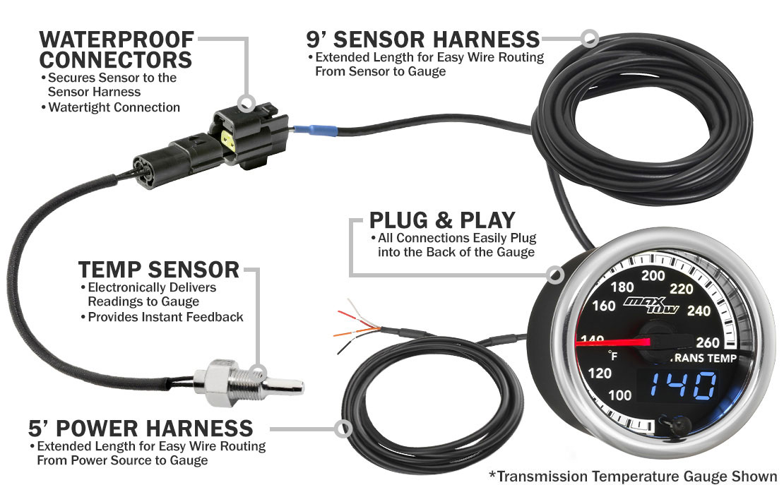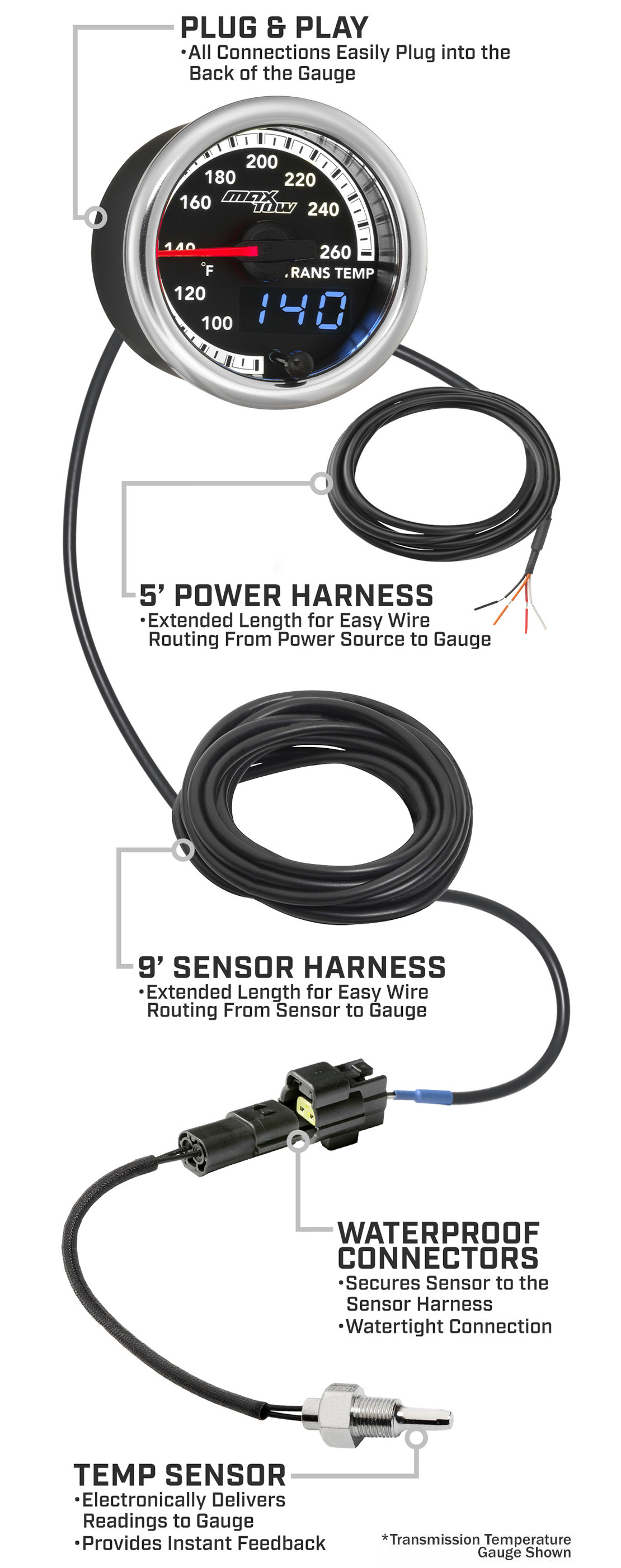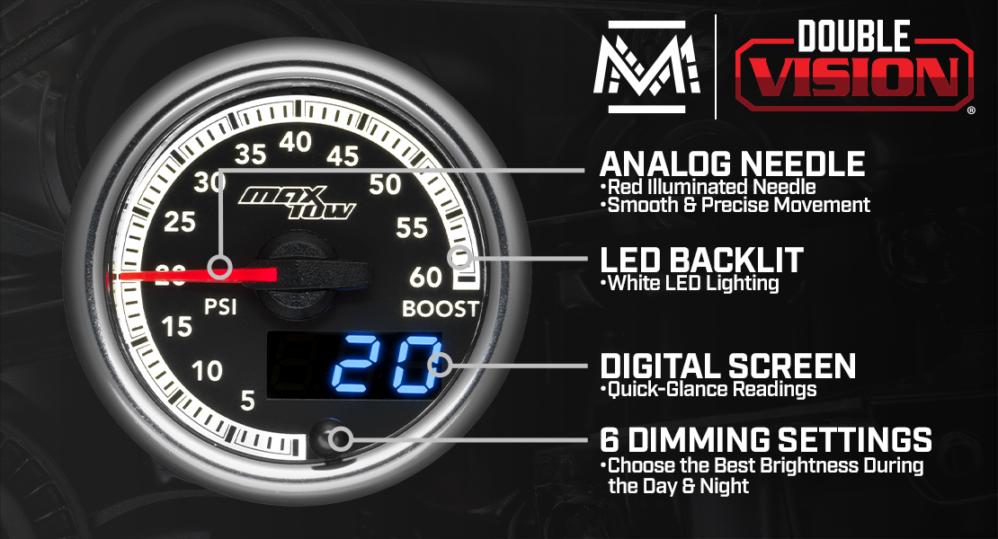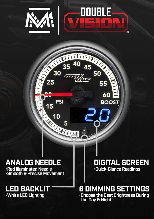 MaxTow Match 4th Gen Cummins Series Gauges deliver factory spec styling with a black gauge dial, clear flat lens and chrome trim ring to match factory gauges. View readings on a Double Vision dual analog and digital LED display. The analog display has white backlighting and an illuminated red needle with stepper motor technology that delivers exceptionally smooth needle movement and extremely accurate readings. At the same time take digital numerical readouts on the corresponding white digital display.