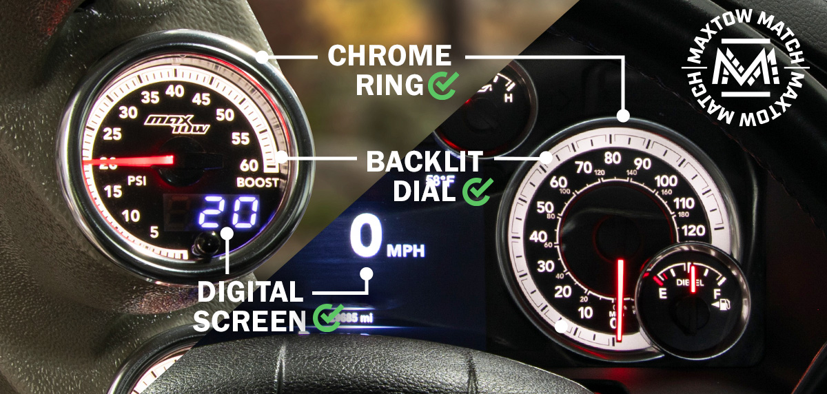 The MaxTow Match Series was designed specifically for the 4th Gen Cummins with a line of gauges that are virtually identical to the look of your factory dashboard. Add aftermarket 6.7 Cummins gauges to your Dodge Ram’s A-pillar for the ultimate monitoring experience. MaxTow Match 4th Gen Cummins gauges deliver an OEM style which enhances the interior of any 2010-2018 Dodge Ram 2500 & 3500 while accurately tracking critical engine readings.