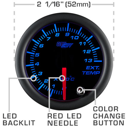 The illuminated red needles that this gauge is equipped with sweep 270° and are powered by stepper motor technology, giving you an effective combination of incredibly precise gauge readings and extremely smooth needle movement. GlowShift’s 7 Color through dial lighting system allows you to select and change the color of your gauge lighting display by simply pressing the button located on the front of the gauge. |