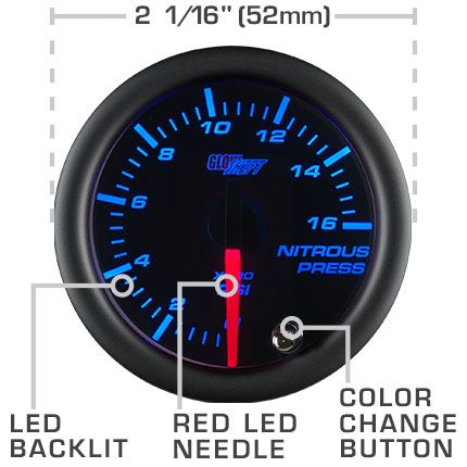 GlowShift’s Tinted 7 Color Series Nitrous Pressure Gauge allows you to easily monitor your car’s nitrous pressure levels from 0 to 1600 PSI. This NOS pressure gauge is electronically driven and features a 1/8-27 NPT pressure sensor that installs directly to the port on the nitrous tank for extremely accurate readings. Monitoring your nitrous pressure levels has several benefits including making sure that your system has the correct amount of pressure for your specific setup.