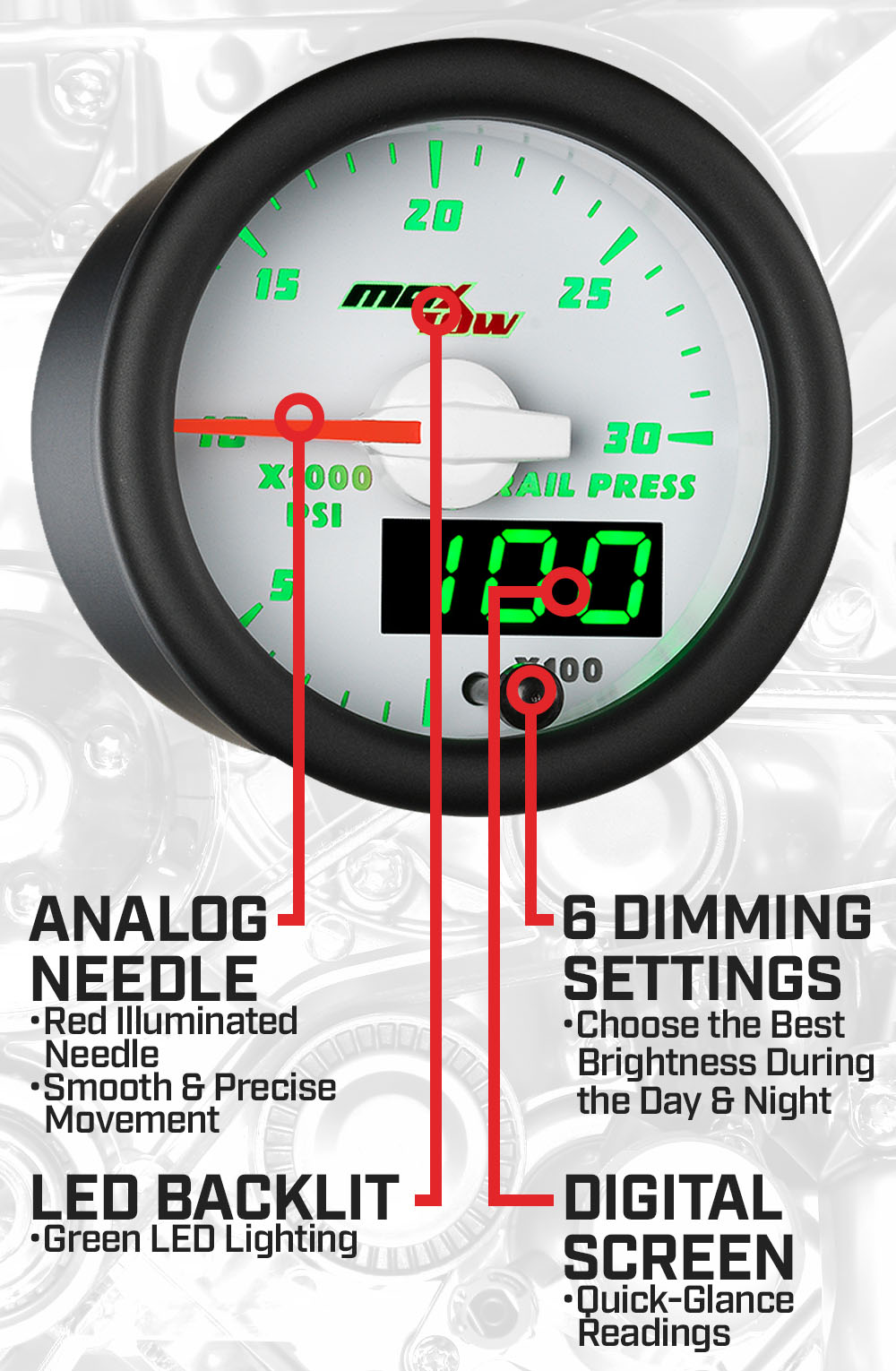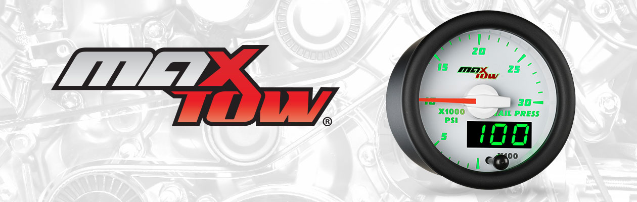 MaxTow White & Green Double Vision™ 30,000 PSI Fuel Rail Pressure Gauges are compatible with the 2003-2018 Dodge Ram 5.9 Cummins & 6.7 Cummins, and 2002-2018 Chevrolet Silverado or GMC Sierra 6.6 Duramax. This diesel fuel rail pressure gauge reads your truck’s high fuel pressure levels from 0 to 30,000 PSI directly from the common rail, monitoring your Cummins or Duramax engine with unrivaled accuracy. Protect against damage to the fuel pump and injectors while avoiding a loss in overall horsepower. Get ready to hit the road and Tow to the Max™