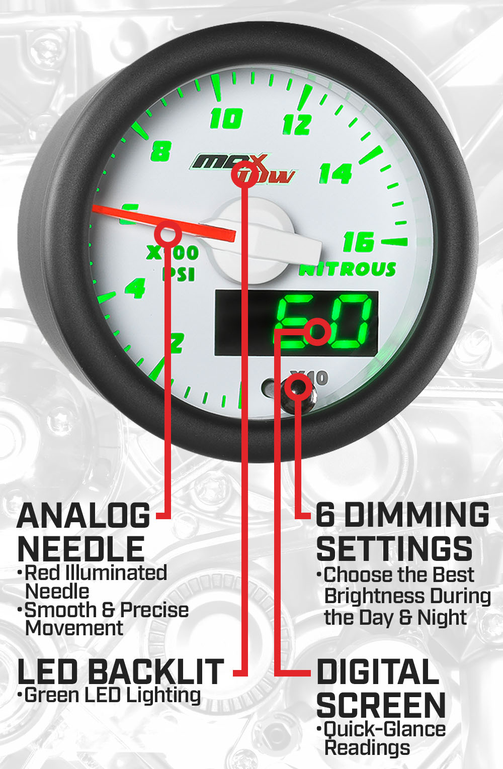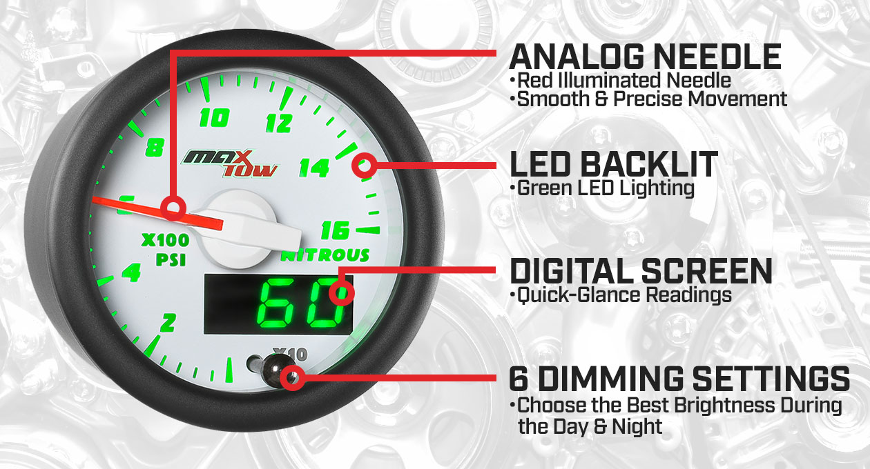 MaxTow White & Green Double Vision™ Truck Nitrous Pressure Gauges measure the amount of nitrous oxide present in the bottle of your diesel nitrous system. This NOS gauge reads nitrous pressure levels from 0 to 1,600 PSI through use of the included 1/8-27 NPT Electronic Pressure Sensor that installs directly to the nitrous bottle. Since most bottles are installed in the truck bed or behind the front seats, it is virtually impossible to view nitrous oxide levels when you’re driving. With MaxTow NOS Bottle Gauges for trucks you can easily view levels while driving with the gauge mounted on the A-pillar, dash or another location. Get ready to hit the road and Tow to the Max™