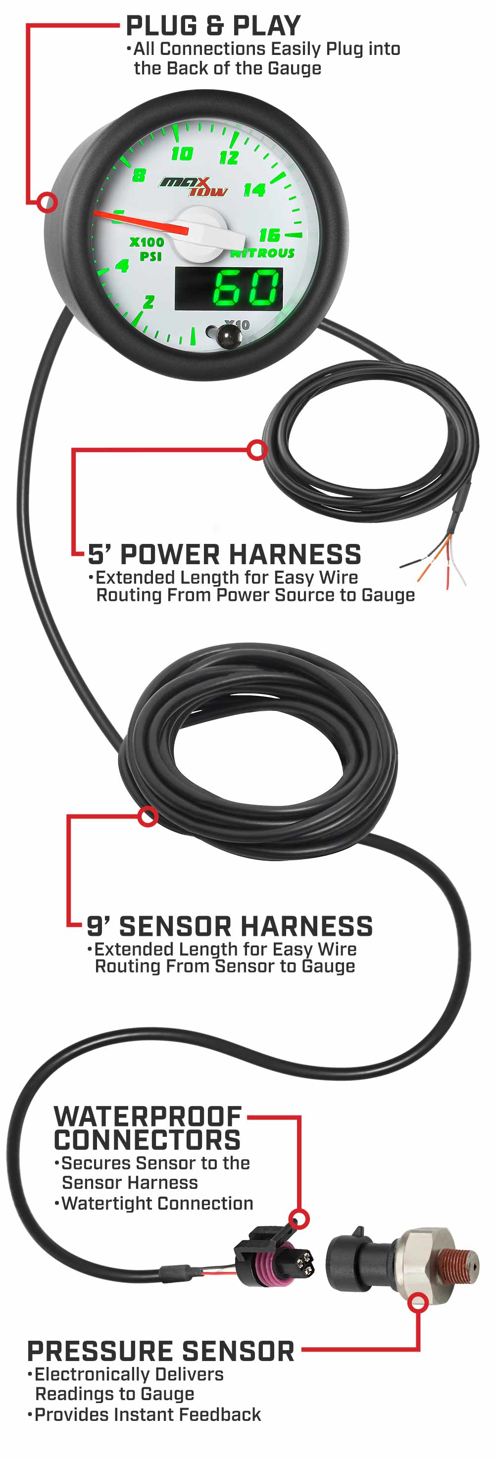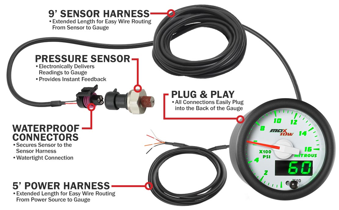 MaxTow NOS Pressure Gauges for trucks feature sensor and power harnesses with extended lengths for added flexibility during installation. The sensor harness is 9’ and the power harness is 5’, assuring you’ll have more than enough wiring for a seamless install. Easily attach both harnesses to the back of this nitrous gauge for trucks by utilizing Plug and Play connectors.